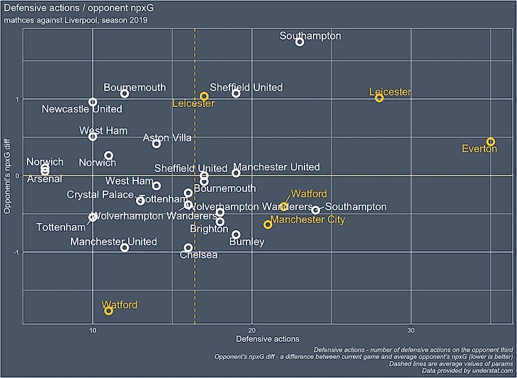 В правой части графика мы видим команды, которые пытались прессинговать Ливерпуль. Например, Эвертон и Лестер (около 9 PPDA за матч). Однако, к положительным результатам это не привело. Скорее наоборот, матчи закончились с 2.4 и 3 npxG Ливерпуля, что выше их среднего за сезон.