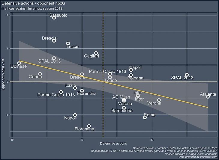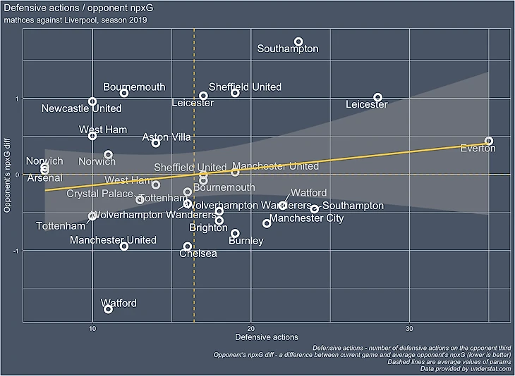 ось X - defensive actions соперников, это то насколько активно команды прессинговали Ливерпуль