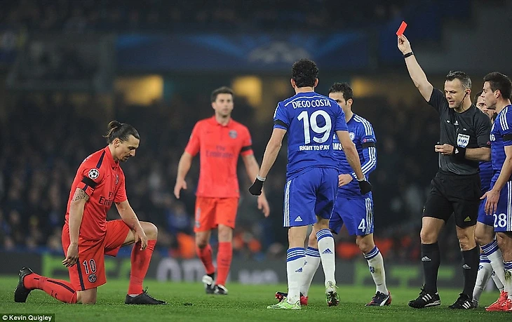 Ответная игра на Стэмфорд Бридж началась довольно осторожно. Оба соперника не летели вперёд, а лишь нащупывали свою игру. И вот, на 30 минуте, Златан Ибрагимович, летя за мячом в подкате чудом не врезается в летящего за этим же мячом в том же подкате Оскара. Если бы Златан не успел поджать ноги-Оскар бы закончил карьеру в том матче, это могла быть тяжелейшая травма, но Златан феноменальный атлет. Красная была по делу, это опасная игра. Парижане остались в меньшинстве. К слову, мерзкий Диего Коста в тот вечер своим отвратительным поведением заслуживал 2 красные. Но что есть то есть.