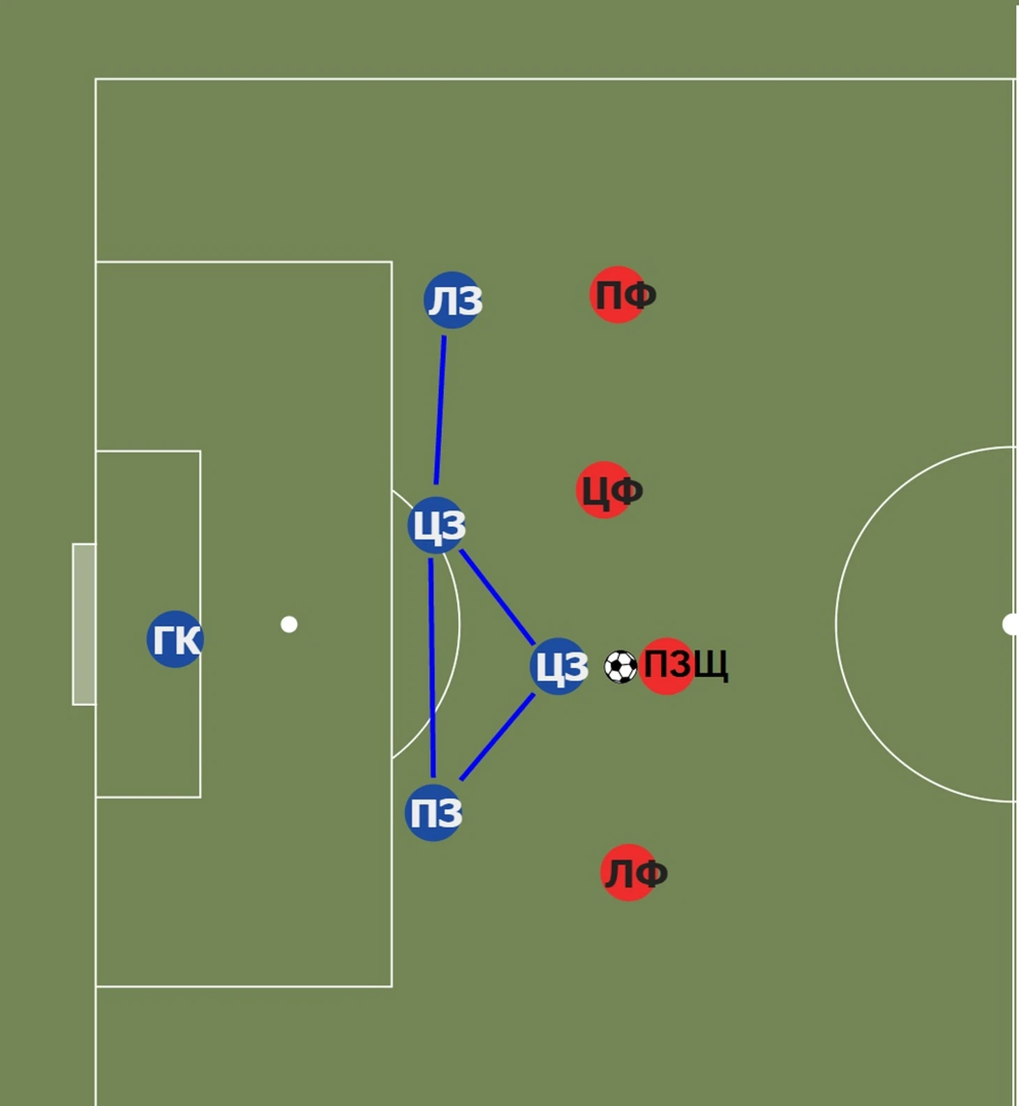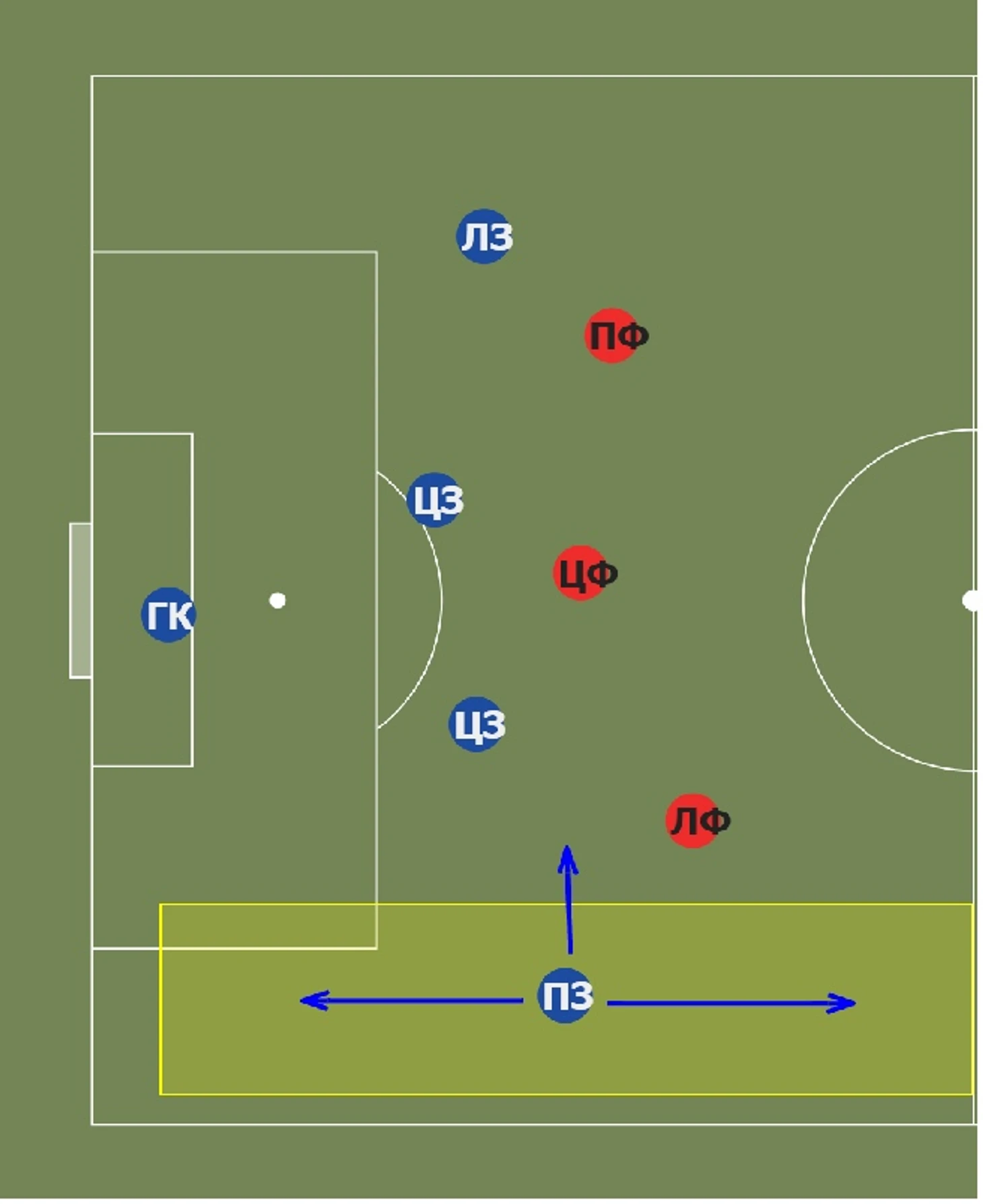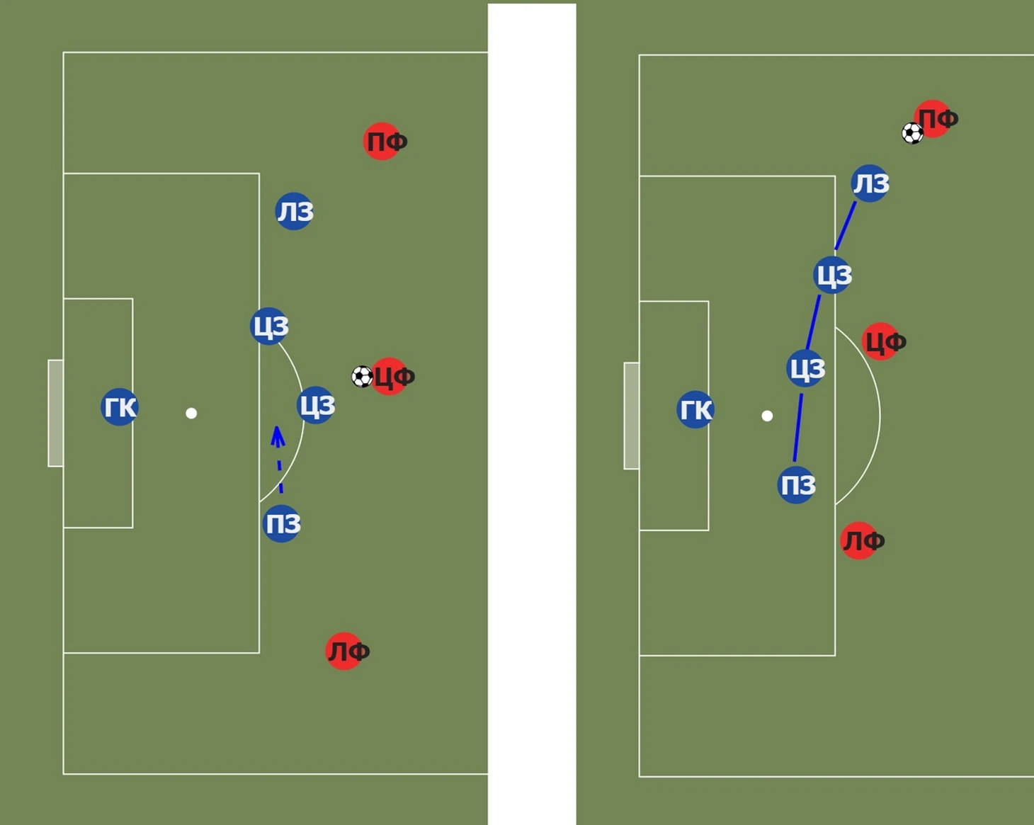 Что по поводу действий крайнего защитника в зависимости от направления атаки соперника. Если она идет через центр поля, то защитник смещается в центр, оставляя своего игрока на фланге открытым. Если атака идет через противоположный фланг, то крайний идет на подстраховку к центральному защитнику. При этом он высматривает возможность организации искусственного офсайда.