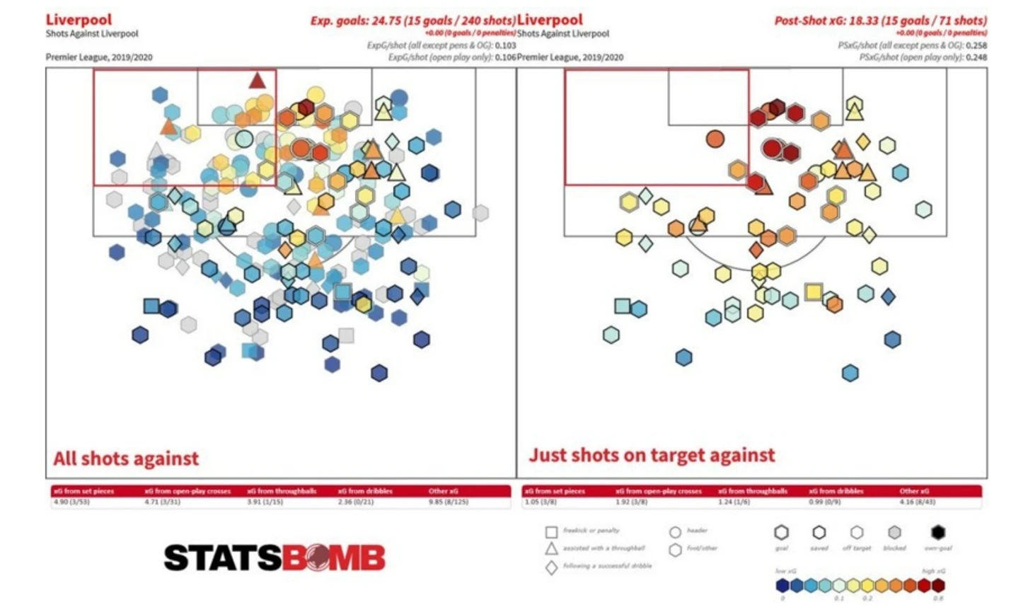 “Красные” допустили ударов из-за штрафной на 4.5 xG, а в целом за сезон – 28.7 xG. Пропустили 1 с лонгшота и 21 в целом, соответственно. И здесь мы подбираемся к моменту воздаяния должного вратарям, в частности, одному вратарю – Алиссону.