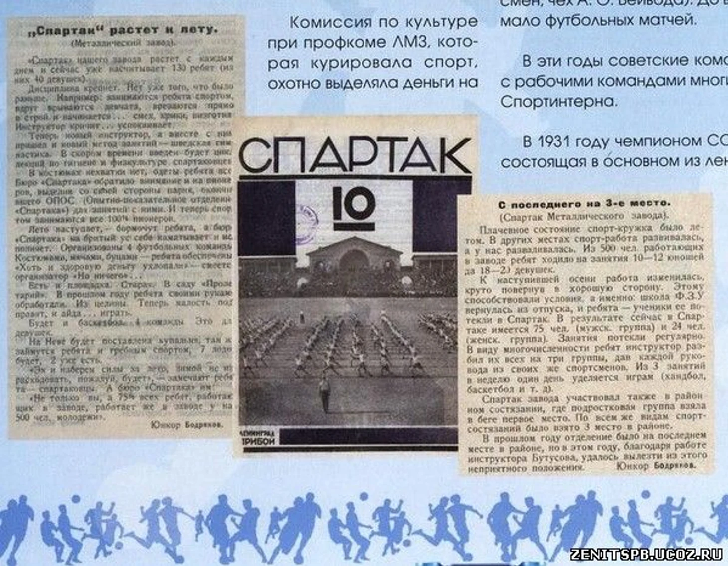 «Никакого коммерческого предприятия с таким названием не существовало» - утверждает петербургский футбольный историк Юрий Лукосяк. Это не совсем так: еще в 1922-1924 годах в Петрограде действовал завод «Зенит», однако команда появилась в 1925 на другом заводе - Ленинградском металлическом. Первоначально она именовалась... «Спартак». Одноименное спортивное общество существовало в Северной столице в 1922-27 годах и насчитывало более 50 тысяч участников. Эта заметка и является точкой отсчета, от которой ведется история «Зенита».
