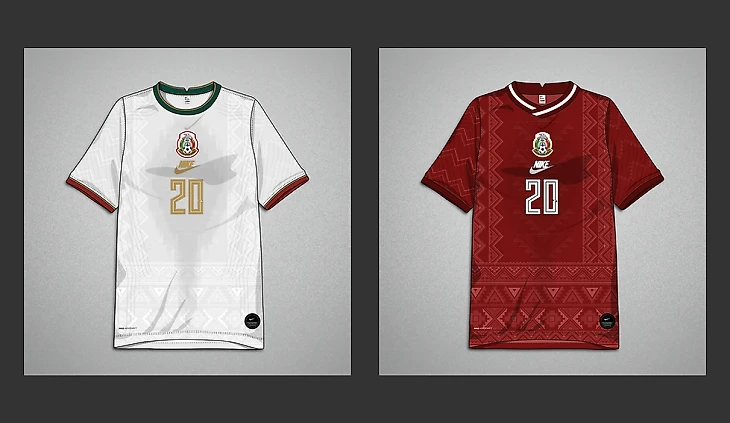 Истории много в форме для сборной Мексики. «Эта концепция вдохновлена недавно выпущенным комплектом Nigeria Nike, – объясняет Маркус. – Чтобы добавить историю в дизайн, я провел очень тщательное исследование. Ацтеки правили в Мексике между 1300 и 1521 годами, я украсил форму узором в традиционном ацтекском стиле».