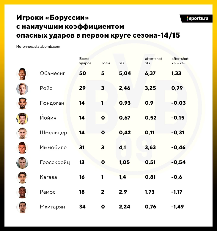 В первом круге из тех, кто у «Дортмунда» нанес минимум 12 ударов, только Обамеянг и Ройс вышли в плюс по этому показателю, т.е. именно их удары доставляли вратарю максимальные трудности. Особенно бросается в глаза напрочь сбитый прицел Мхитаряна, который 34 раза бил по воротам и лишь 7 раз попал в створ (ни одного забитого гола в первом круге).