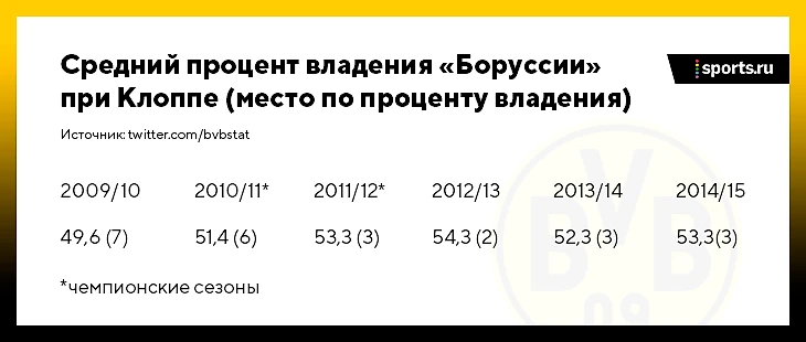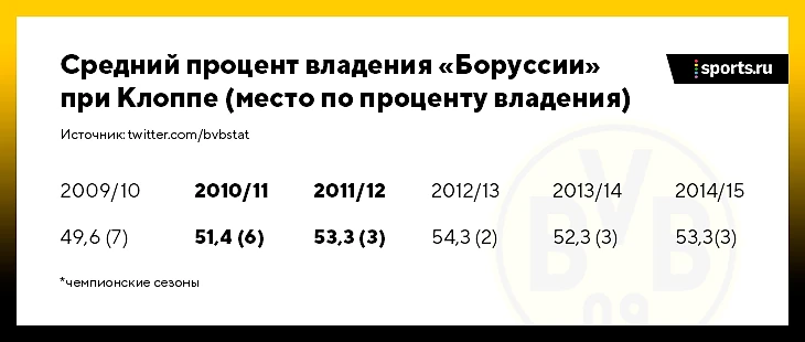 По спринтам, пробегу, точности передач этот сезон Клоппа в «Боруссии» не отличался от предыдущих. Игровая философия (вертикальные атаки и гегенпрессинг) тоже сохранилась