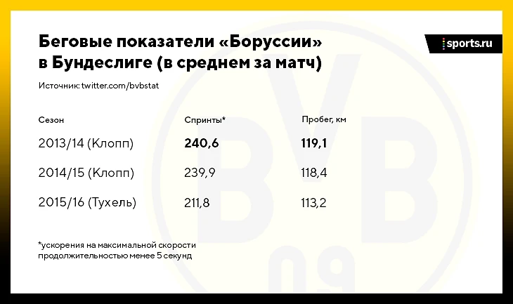 Видимых причин стартового провала почти не было: и по среднему количеству спринтов за матч, и по общекомандному пробегу, и по остроте моментов «Боруссия»-14/15 держалась примерно на том же уровне, что и в предыдущие годы при Клоппе (в первом круге, например, перебегали всех конкурентов – в среднем 120 км за матч).
