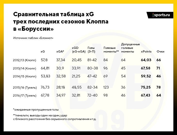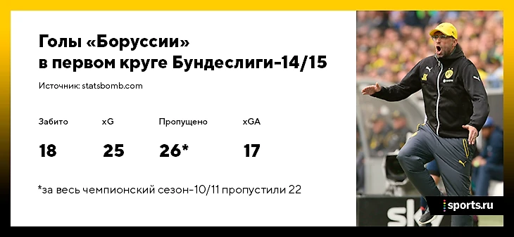 Раньше у команды Клоппа не было проблем с реализацией. В двух предыдущих сезонах «Дортмунд» выжал максимум из голевых моментов, забивая даже из неочевидных ситуаций (отсюда большая разница между ожидаемыми и реальными голами). Судя по ожидаемым пропущенным голам в сезоне-14/15, дортмундцы не играли в обороне сильно хуже и держались на показателях двух предыдущих лет, но из-за того, что параллельно у атаки сбился прицел, команда потеряла много важных очков.