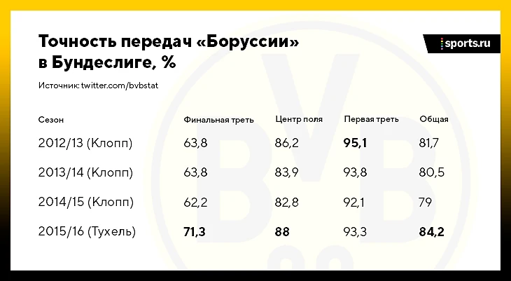 При Тухеле чуть подрастет процент точных передач в каждой из зон, но за счет того, что его команда просто будет больше играть в пас. Клопп же в Дортмунде не любил передерживать мяч и всегда двигал его к чужим воротам по кратчайшему маршруту.