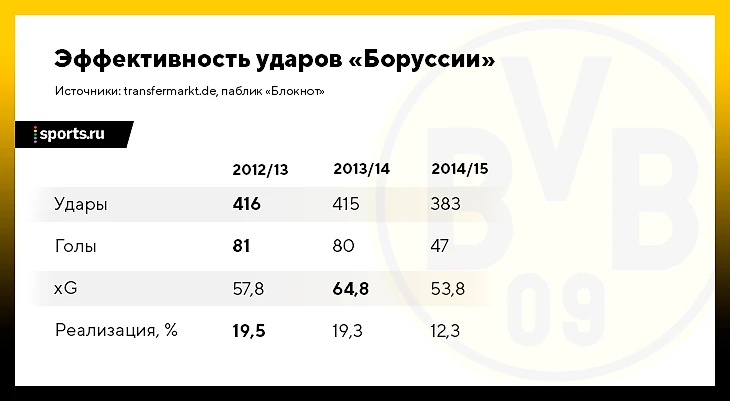 «Дортмунд» закончил сезон в топе самых бьющих команд из чемпионатов большой пятерки с показателем 16,8 ударов в среднем за игру (чаще били только «Реал», «Сити» и «Бавария»). Тем не менее конвертация ударов в голы по итогам сезона-14/15 упала на 7% по сравнению с показателями трех предыдущих лет.