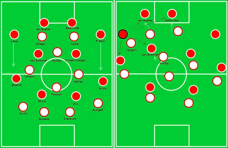 Закрывая пространство для крайних защитников и прижимая их ближе к боковой линии, игроки «Майнца» вынуждали тех пасовать назад на центрбеков или же вбок на опорных полузащитников. Это оказывало дополнительное давление на слабоиграющих ногами ван Бюйтена и Бадштубера. Спеша на помощь своим защитникам, опорные полузащитники опускались все ниже и ниже к своим воротам, но это только прибавляло проблем «Баварии». Если Бастиан Швайнштайгер был довольно тонок при работе с мячом, то Марк ван Боммель, прежде всего, славился своим умением подключаться из глубины, либо же способностью въехать кому-то шипами в голеностоп, однако выход из под прессинга никогда не был его сильной стороной.