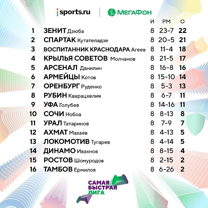 Итоговая таблица Самой быстрой лиги от Sports.ru и МегаФона! Ждем Суперфинал со «Спартаком» и «Зенитом».