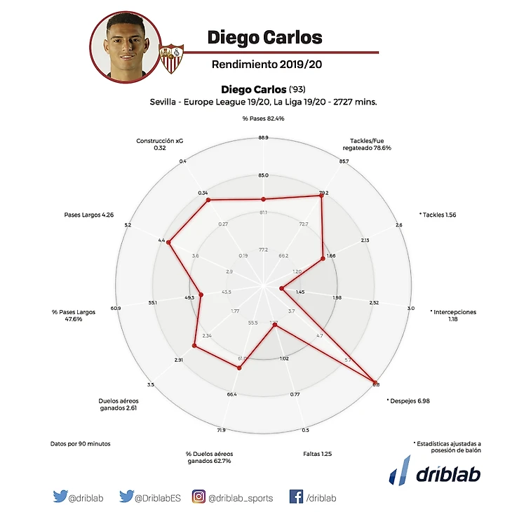 Диего Карлос выделяется двумя показателями. Одним из них является процент выигранных единоборств (80,95%, это лучше, чем у 82% центральных защитников 5 лиг). Другой – выносы (5.1, лучше, чем 87%), так как его выбор позиции в штрафной весьма грамотен.