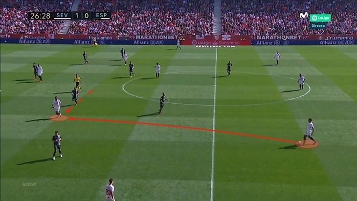 В следующем примере Диего Карлос прикрывает левый полуфланг. Сопернику сначала удается получить пару метров преимущества, но бразильский защитник быстро реагирует и делает отличный отбор в очень сложной и рискованной ситуации.