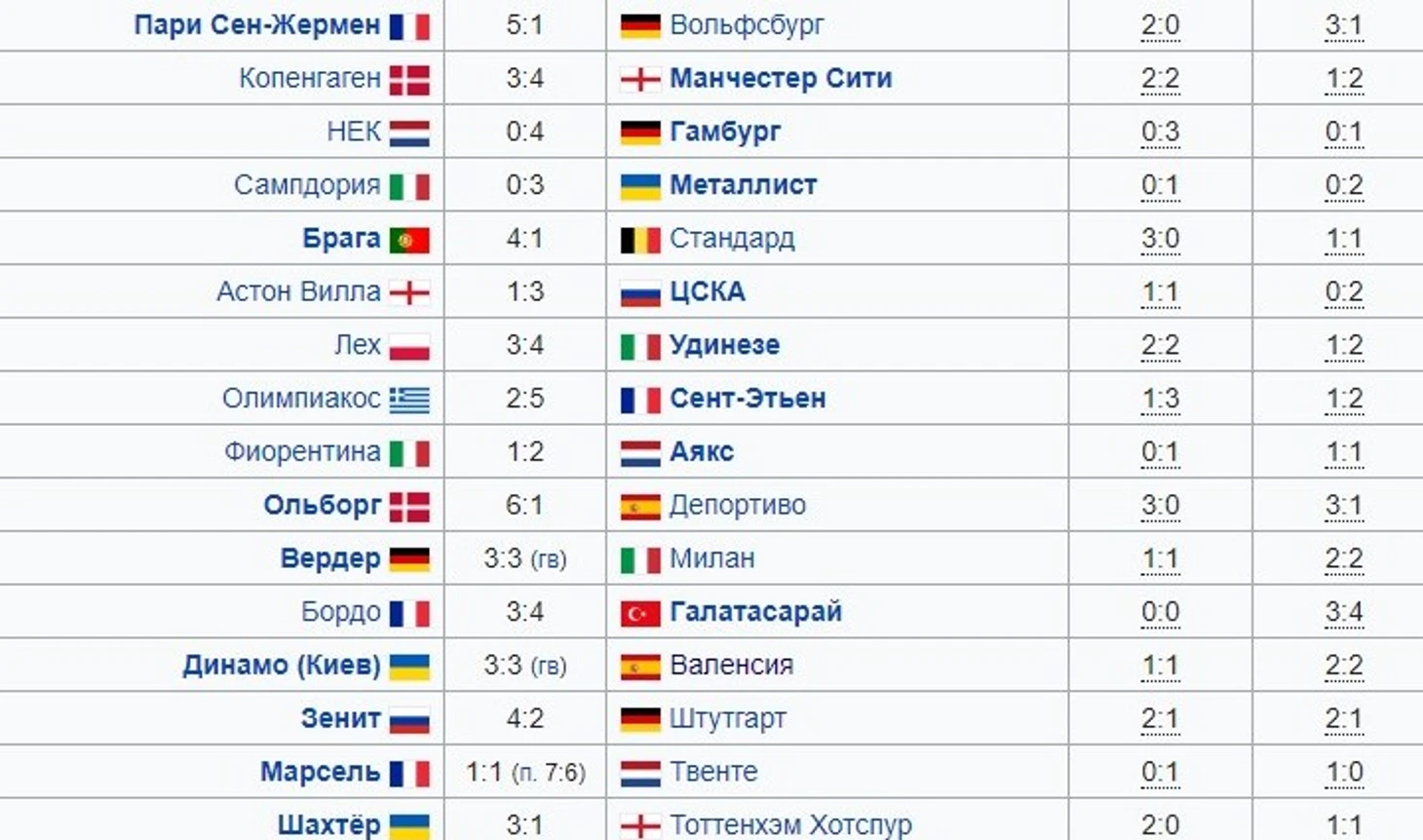 Украинские клубы также порадовали своих болельщиков. Металлист продолжил свою сухую серию, победив Сампдорию 1:0 и 2:0. Шахтёр уверенно выиграл первый матч у Тоттенхэма, но во втором дал лондонцам надежду на успех. Отобрал эту надежду Фернандиньо, на 86 минуте установив итоговый результат – 2:0 и 1:1. Тяжелее всего пришлось Динамо. В соперники киевлянам попалась грозная Валенсия с Чемпионами Европы Давидом Сильвой, Давидом Вильей, Карлосом Марченой, Раулем Альбиолем, опытными Альбельдой и Марьентесом, а также с молодым Хуаном Матой в составе. Подопечные Сёмина дважды сыграли вничью – 1:1 дома и 2:2 в гостях, за счёт чего прошли дальше. По похожему сценарию складывалось противостояние Милана и Вердера. В Германии команды сыграли 1:1, а ничья на Сан-Сиро 2:2 оказалась в пользу Вердера. Знатную перестрелку устроили Галатасарай и Бордо. Сыграв первый матч 0:0, в ответном команды дали жару. Французы, игравшие в гостях, открыли счёт уже на первой минуте. Усилиями Арда Турана и Харри Кьюэлла стамбульцы к 65 минуте вели с комфортным счётом 3:1. Но за три минуты Шамах и Кавенаги вернули Бордо в игру. Победный гол турки забили только на 88 минуте. Результаты всех матчей 1/16 финала: