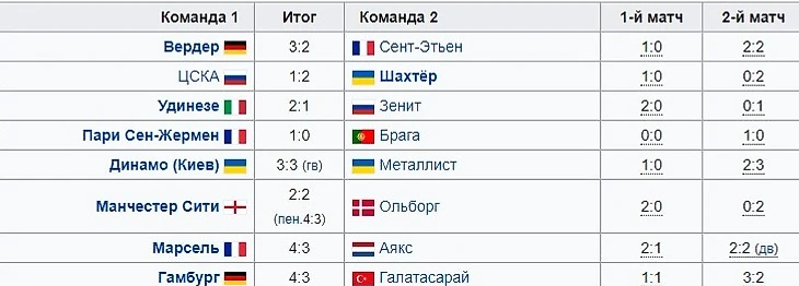 В 1/8 наконец-то пропустил Металлист от соотечественников из Динамо, проиграв первый матч с минимальным счётом. Во втором харьковчане навязали борьбу и дважды выходили вперёд с необходимым преимуществом в два мяча, но оба раза киевляне отыгрывались. Решающий гол в свои ворота забил защитник Березовчук, который появился на поле за 5 минут до этого.Потрепал нервы своим болельщикам и Манчестер Сити. В первом матче горожане уверенно обыграли Ольборг 2:0, но во втором датчане дали бой, отыграв два мяча. Причём второй был забит с пенальти на последней минуте основного времени. Но в серии пенальти удачливее оказались именно англичане (почти оксюморон), победив 4:3. Не хватило основного времени и Аяксу с Марселем. В первом матче французы одержали победу 2:1, в ответном с аналогичным счётом победили голландцы. В составе Аякса тогда блистал Луис Суарес, в защите играли молодые Блинд, Вермален, Вертонген, Алдервейрелд и Ван дер Вил, в воротах Стекеленбург, в средней линии Эмануэлсон – спустя 5 лет все они разъехались по европейским топ-клубам. Но в 1/4 финала их не пустил Тайрон Мирз – человек, который играл за сборную Ямайку, потому что думал, что его отец ямаец, хотя он из Сьерра-Леоне.