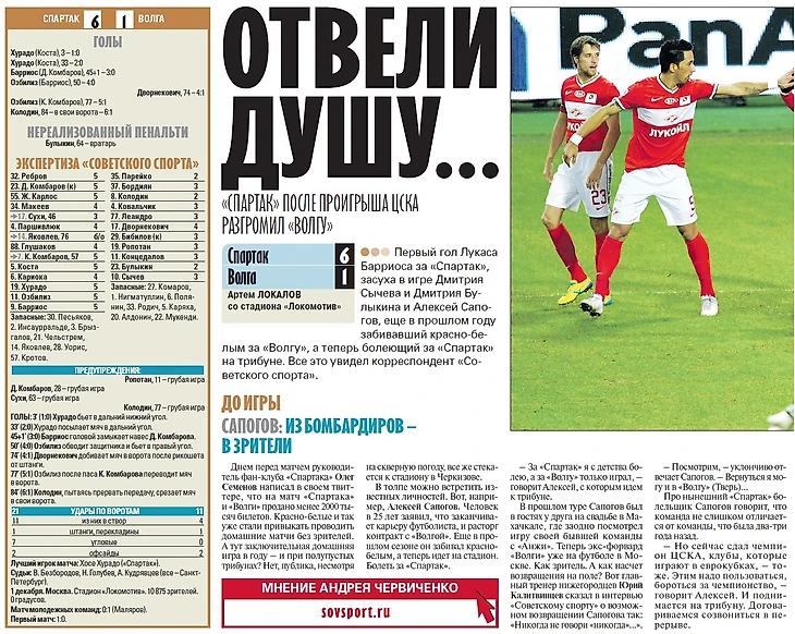 Хорошо помню тот матч. Когда его смотрел, то подумал, а не товарищеская ли идёт игра. Уже на третьей минуте Хурадо пробил в противоход вратарю и вывел красно-белых вперёд. Второй гол пришлось ждать 30 минут. Воспитанник «Реала» получил мяч от Тино Косты и пробил в тот же угол, что и в первом эпизоде. Под конец первого тайма уже Хурадо отдал пас на набегавшего Комбарова, Дмитрий коронной передачей нашёл в центре штрафной Барриоса и парагваец увеличил преимущество до трёх мячей. Автором четвёртого мяча стал Озбилиз. В середине второго тайма «Волга» получила право на пенальти, но Ребров отбил его и не позволил забить гол престижа Булыкину. Но уже на 74 минуте Артёму всё-таки пришлось вытаскивать мяч из ворот. Ребров поскользнулся и расторопнее всех оказался Дворнекович. Пятый гол в одно касание забил Озбилиз, ну, а шестой гол забил Колодин, неудачно подставив ногу и замкнув мяч в собственные ворота.