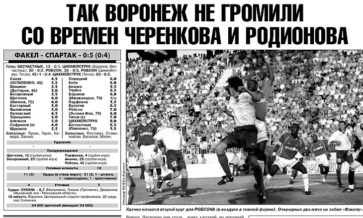 Шестое место в рейтинге занимает матч 18 августа 2001 года - «Факел» 0-5 «Спартак»