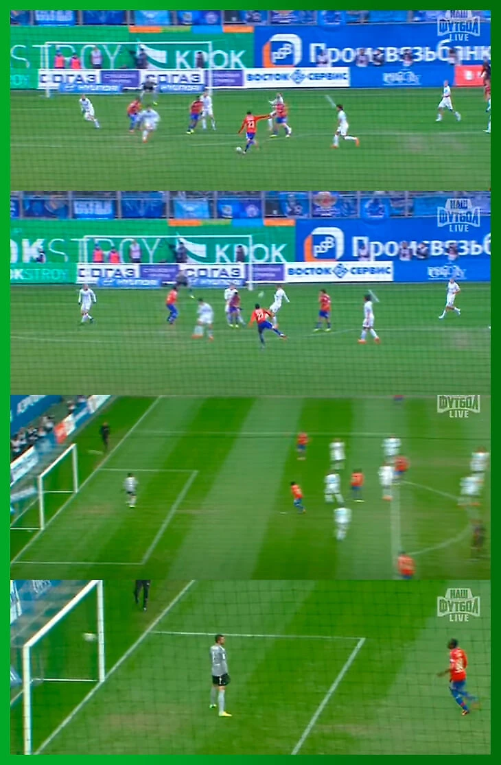 На 32-й минуте Фернандес фирменно пробежал по левому флангу, а дальше пошла игра в касание: Дзагоев откатил – Миланов выстрелил – Лодыгин остался без касаний.