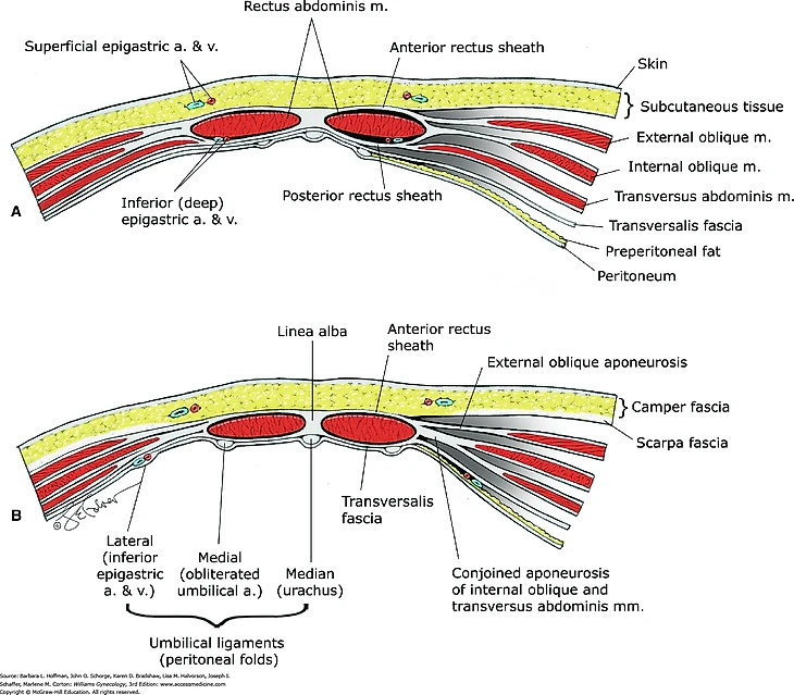 На рисунке изображены мышцы живота послойно: верхний – самый наружный, прямая мышца живота – два овала посередине. Желтым – слой подкожно-жировой клетчатки. В этом и кроется главная трудность прокачки пресса – мышцы небольшие и даже при жесткой их закачке они будут до последнего скрыты слоем жира, если не сушиться. Поэтому если вы хотите красивый пресс, но есть пара лишних кило – уделите внимание сначала им и своему питанию.