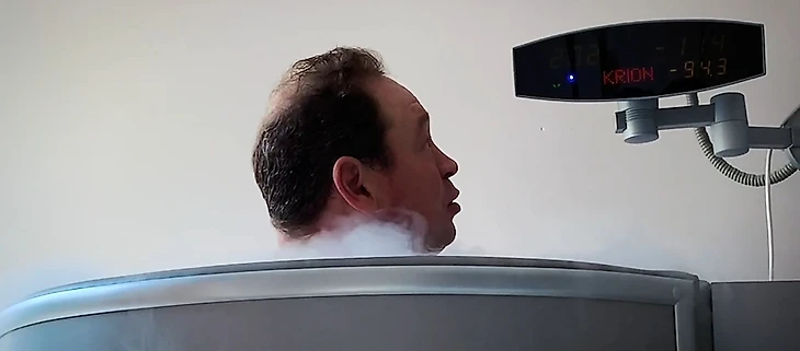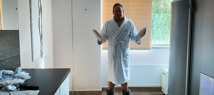 «У меня тут – в хорошей клинике для детокса – есть деревенские вещи. Вот я в валенках, в рукавицах, и сейчас меня ждет испытание века – я буду стоять 3,5 минуты в криосауне при температуре -115 градусов».