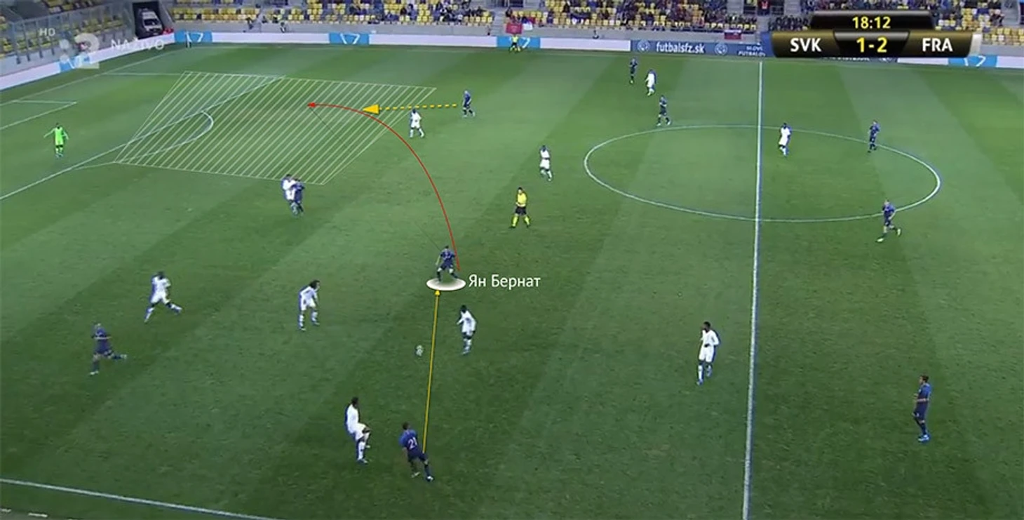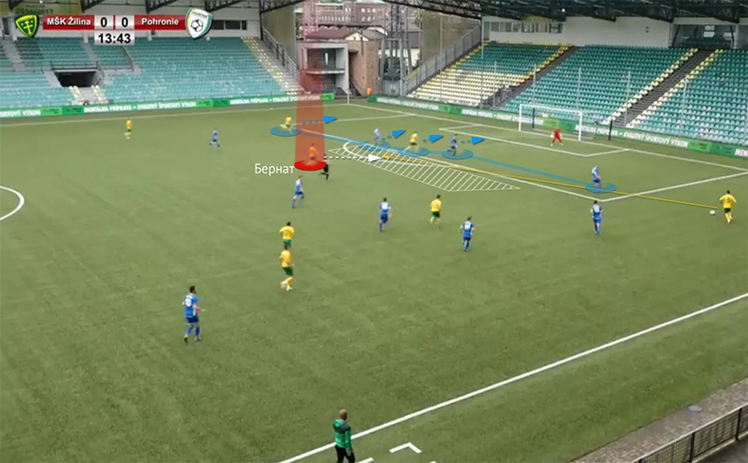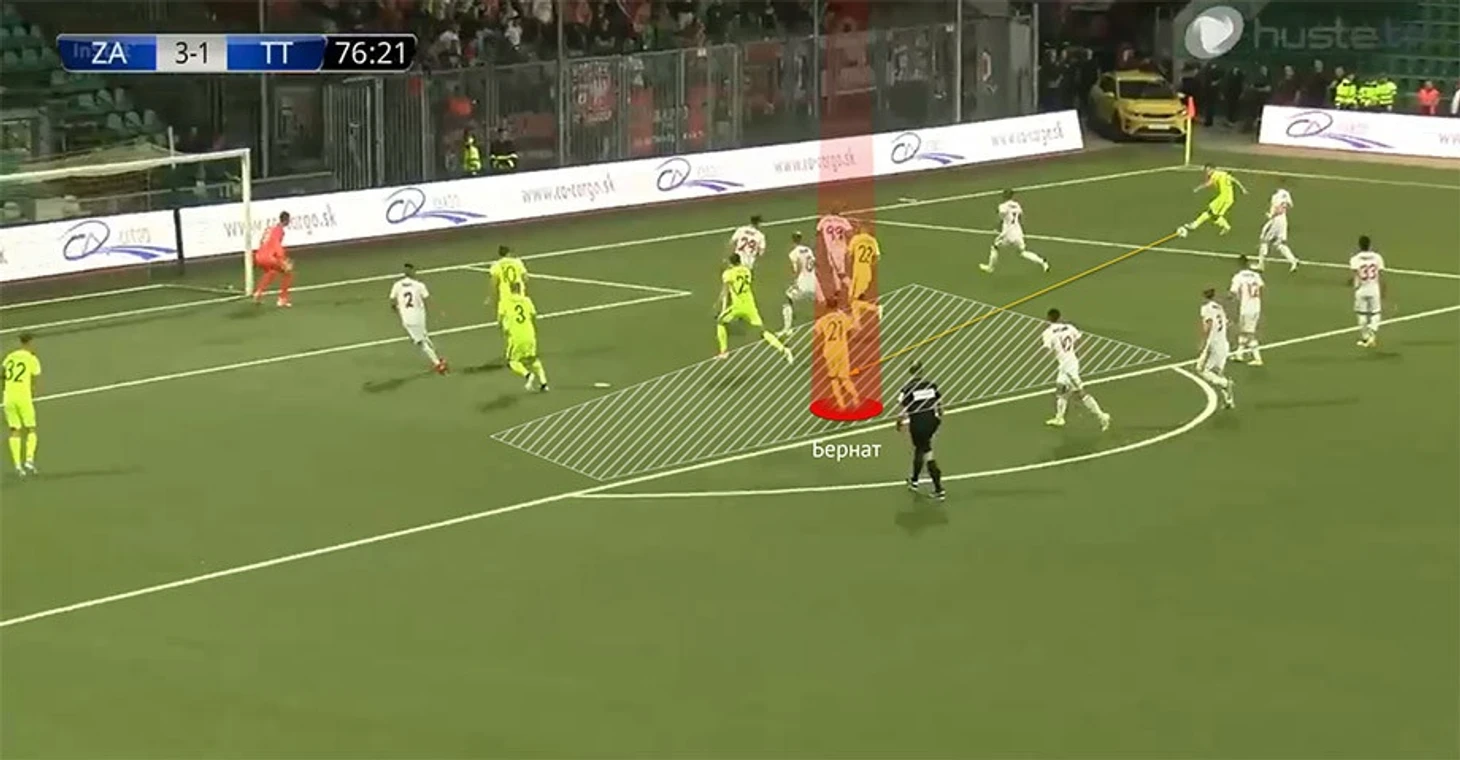Этот манёвр традиционно сложно контролировать. В «Жилине» он встроен в командный механизм превосходно, поэтому сразу 5 голов в сезоне (и ещё много опасных ударов) Бернат соорудил похожим образом, набегая из зоны подбора.
