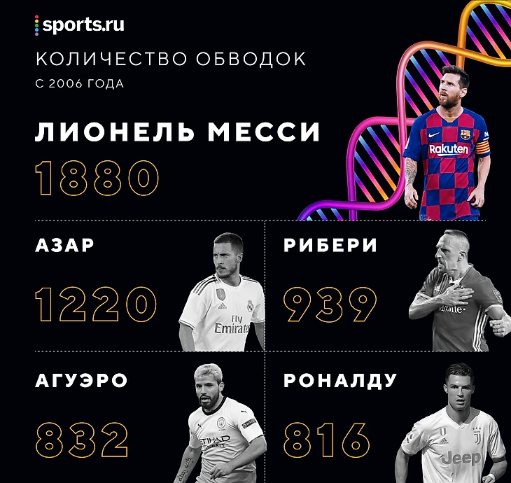 Сам Лео тоже стал поскромнее (5,6 обводки), он намного больше пользуется передачами, но свое могучее протаскивание мяча все равно иногда включает. С 2006 года он лучший по количеству обводок – Squawka насчитала 1 880 обводок, это на 600 больше, чем у Эдена Азара со второго места. На третьем месте Франк Рибери (939), четвертый – Серхио Агуэро (832). Криштиану Роналду только пятый – 816.