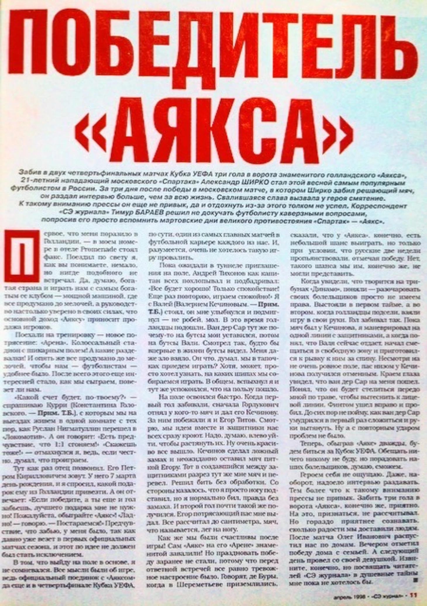 В марте 1998 Спартак в 1/4 Кубка УЕФА прошел Аякс с ван дер Саром, Лаудрупом и де Бурами в составе. 21-летний нападающий Александр Ширко сначала забил два в гостях, а потом вколотил победный мяч в Москве.