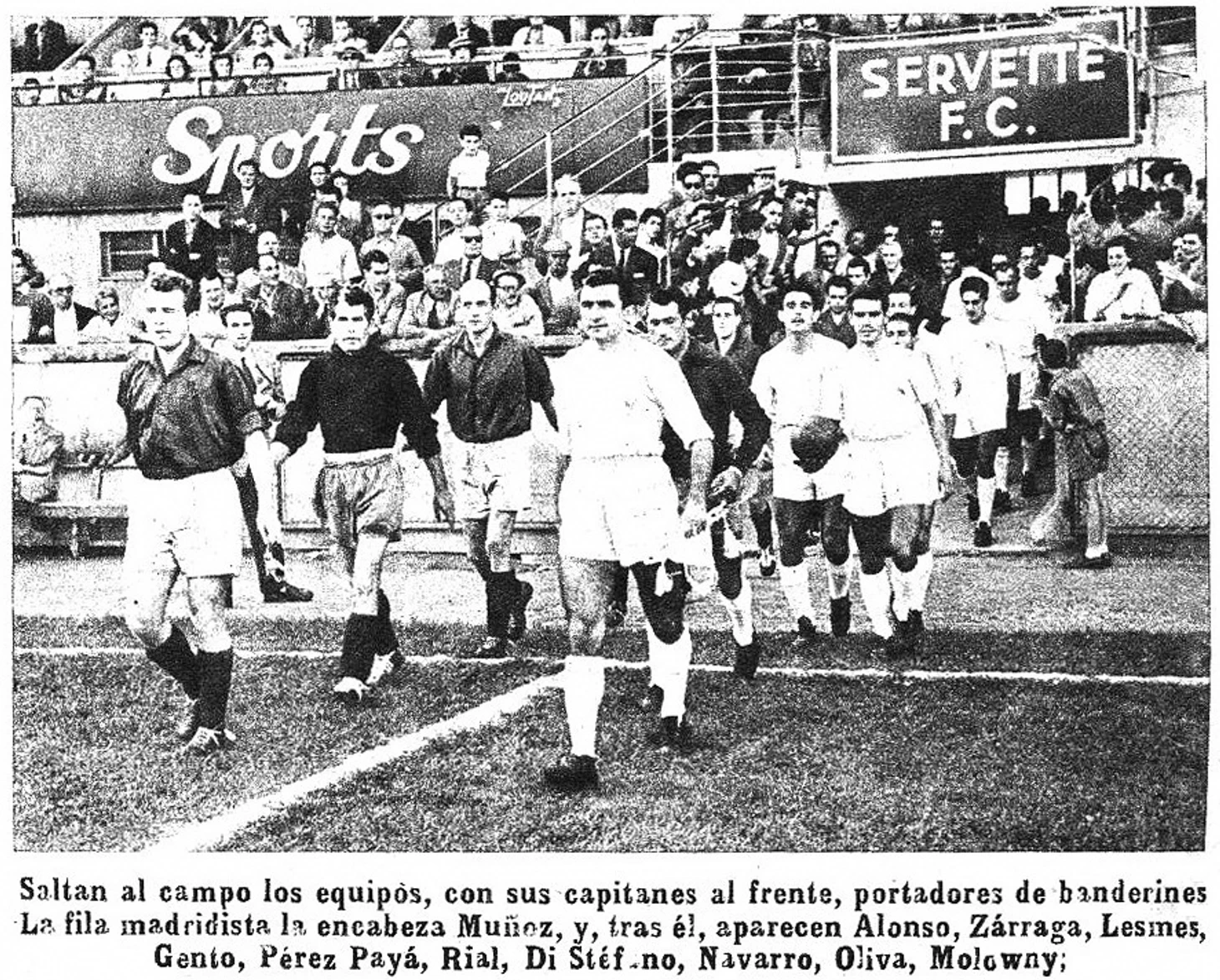Игры проходили по олимпийской системе, с выявлением победителя после двух встреч: «дома» и «в гостях». «Реалу» первым клубом в соперники выпал «Серветт» из Швейцарии. Матч на стадионе в Женеве собрал 7000 зрителей, но радости хозяевам не принес, «Серветт» проиграл со счётом 0-2. Авторами голов стали: капитан «сливочных» Мигель Муньос и Хосе Эктор Риал. В то время «Реал» был одним из лучших клубов Европы, особенно сильны они были у себя дома. В ответной игре «Реал» разгромил соперника со счётом 5-0, дублем отметился Ди Стефано, а по голу забили Иглесиас, Риал и Моловны.