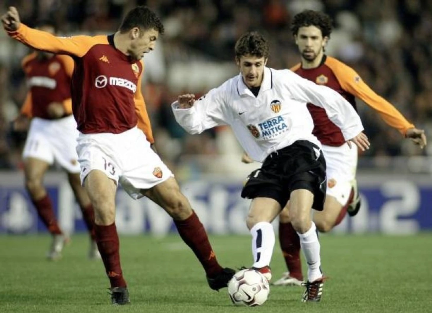 Одно из девяти (!) противостояний между испанской и итальянской командами в рамках Лиги Чемпионов 2002/2003. "Рома" и "Валенсия" выясняли отношения на втором групповом этапе. Также в той группе играли "Арсенал" и "Аякс". К третьему туру "Валенсия" подошла с двумя очками - команда сыграла в ничью с "Аяксом" (1-1 дома) и "Арсеналом" (0-0 в гостях). А вот "Рома" оба стартовых матча проиграла - "Арсеналу" дома (1-3) и "Аяксу" в гостях (1-2). Так что обеим командам было необходимо брать максимум в личных встречах. Первый матч в Риме остался за "Валенсией" - испанский клуб победил благодаря голу Джона Карью на 78-ой минуте.