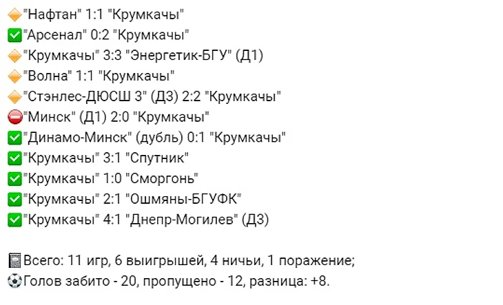 НФК Крумкачы — является одним из претендентов на повышение в классе. Это амбициозная команда с качественным по меркам первой лиги подбором игроков. Большинство футболистов клуба с опытом выступлений в Высшем дивизионе и потенциал у них, определённо, должен быть. В контрольных матчах Крумкачы проявили себя с хорошей стороны: