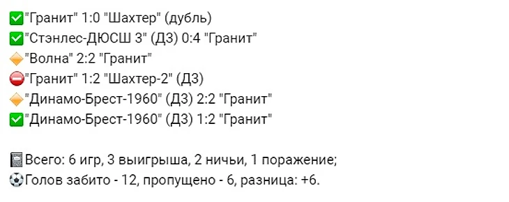 В контрольных матчах Гранит играл в основном только с клубами из третьего по силе дивизиона. Как видим, есть поражение и ничейные исходы. Недостаток спаррингов с сильными соперниками можно отнести к негативным факторам в подготовке клуба.