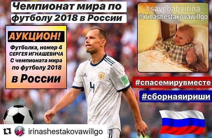 — Я — экс-футболист сборной России, и я выставляю на благотворительный аукцион свою футболку с последнего чемпионата мира, который состоялся у нас в стране, в России, в 2018 году. Аукцион для сбора средств на лечение Ире Шестаковой. Друзья, давайте вместе поможем девочке выздороветь, — сказал Игнашевич в своем видеообращении к поклонникам.