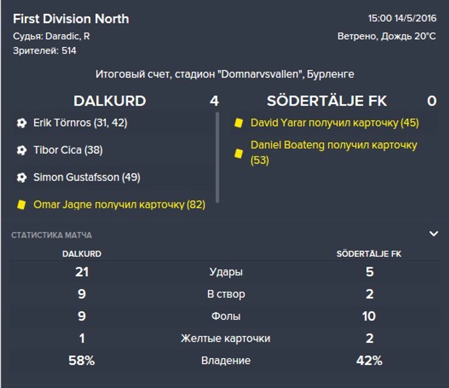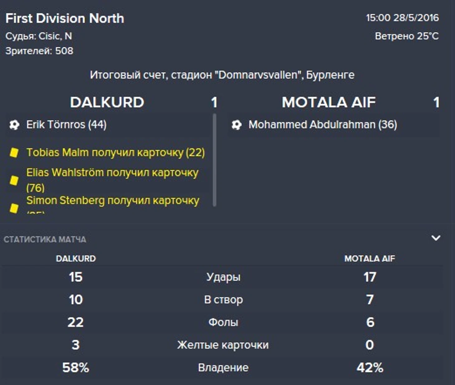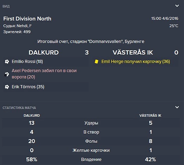 Вообще ничего не дали создать сопернику, очень классно комбинировали, но Торнрос был ужасен в реализации. До последнего держал его на поле, но когда терпение лопнуло вышел Росси и тоже особо не впечатлил. надо искать нового "Мирослава Клозе" чтобы забивать кучу голов! Вышли на первое место с отрывом в 4 очка от 2го места. Следующий матч против ИК Мотала - надеюсь их тоже размотаем.