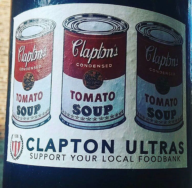 Теперь поговорим о стикере от ультрас лондонского клуба «Клэптон» с их вариацией работы Энди Уорхола «Банки с супом Кэмпбелл».