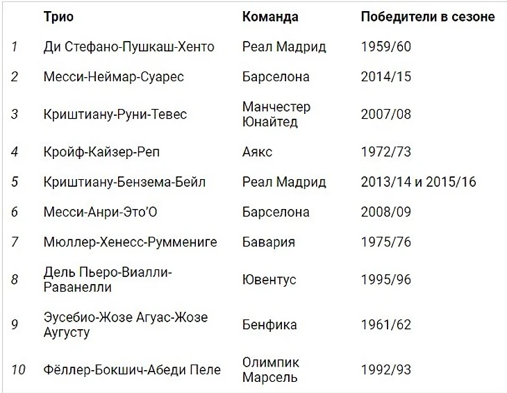 France Football выбрал десятку лучших троек нападения в истории самого престижного европейского клубного турнира.