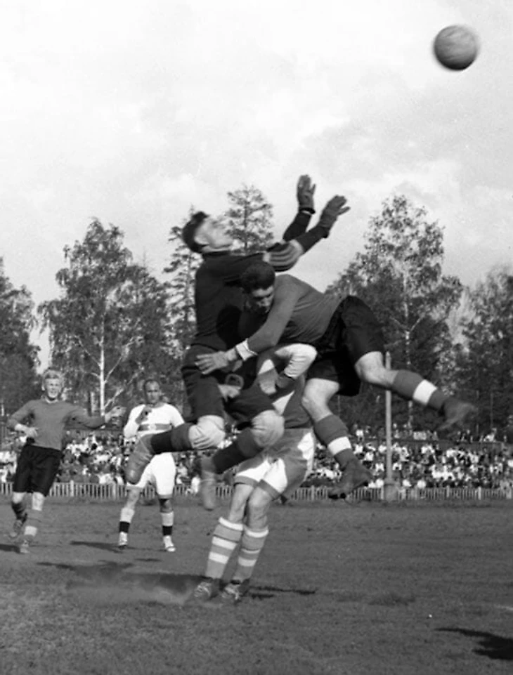 Безымянный вратарь (это точно не Анатолий Акимов — он в тот день был в спартаковских воротах) выставляет руки под высокий мяч, форвард «играет в тело», чуть опоздавший защитник едва не попадает в переплет, но успевает укрыться на заднем плане.