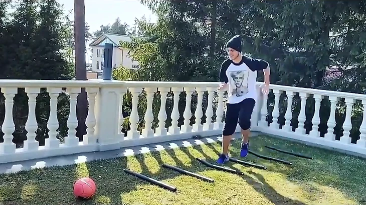 Во время паузы он тренируется во дворе (в футболке с Джастином Бибером) – места немного, но для челнока и несильных ударов по маленьким воротам хватает.