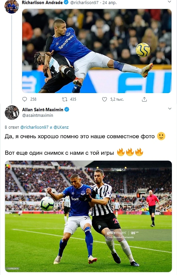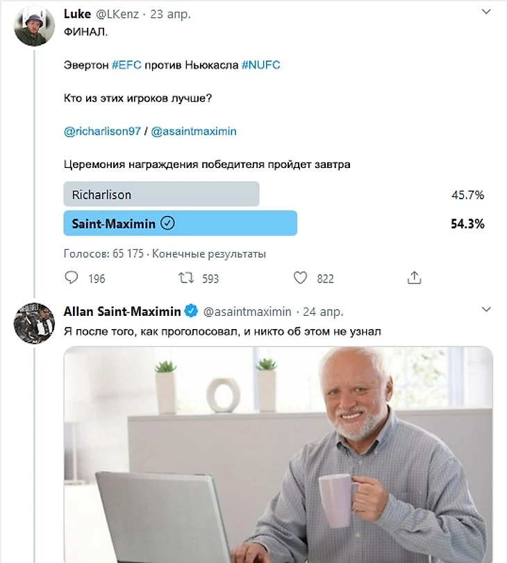 В твиттере довольно часто проводятся различные опросы между болельщиков. Недавно фанаты выбирали лучшего игрока АПЛ среди команд не из «большой шестерки». В финале Сен-Максимен бился с Ришарлисоном и отреагировал на опрос.