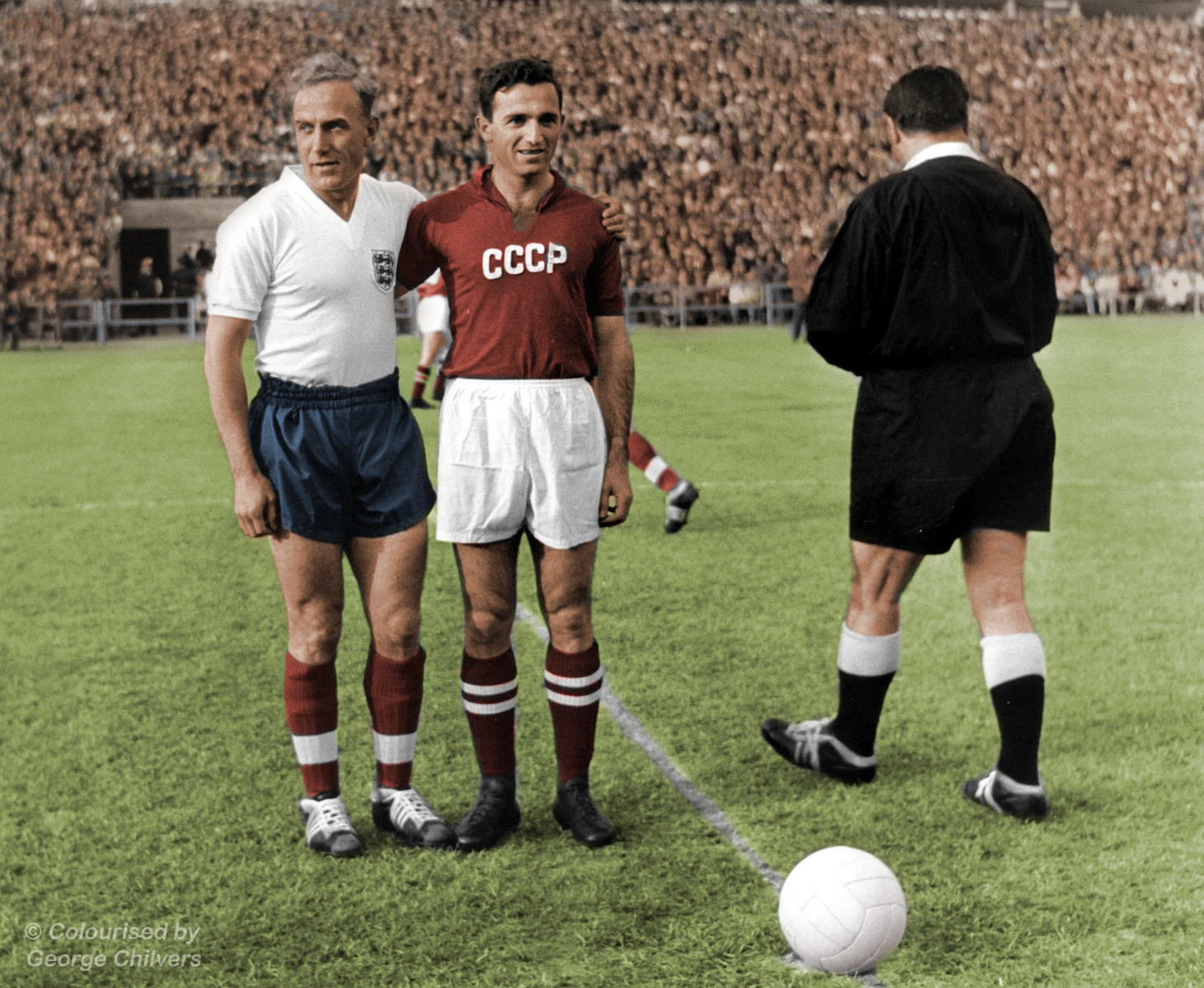 1958 год. Первый в истории сборной СССР чемпионат мира. Никита Симонян и капитан сборной Англии Билли Райт.