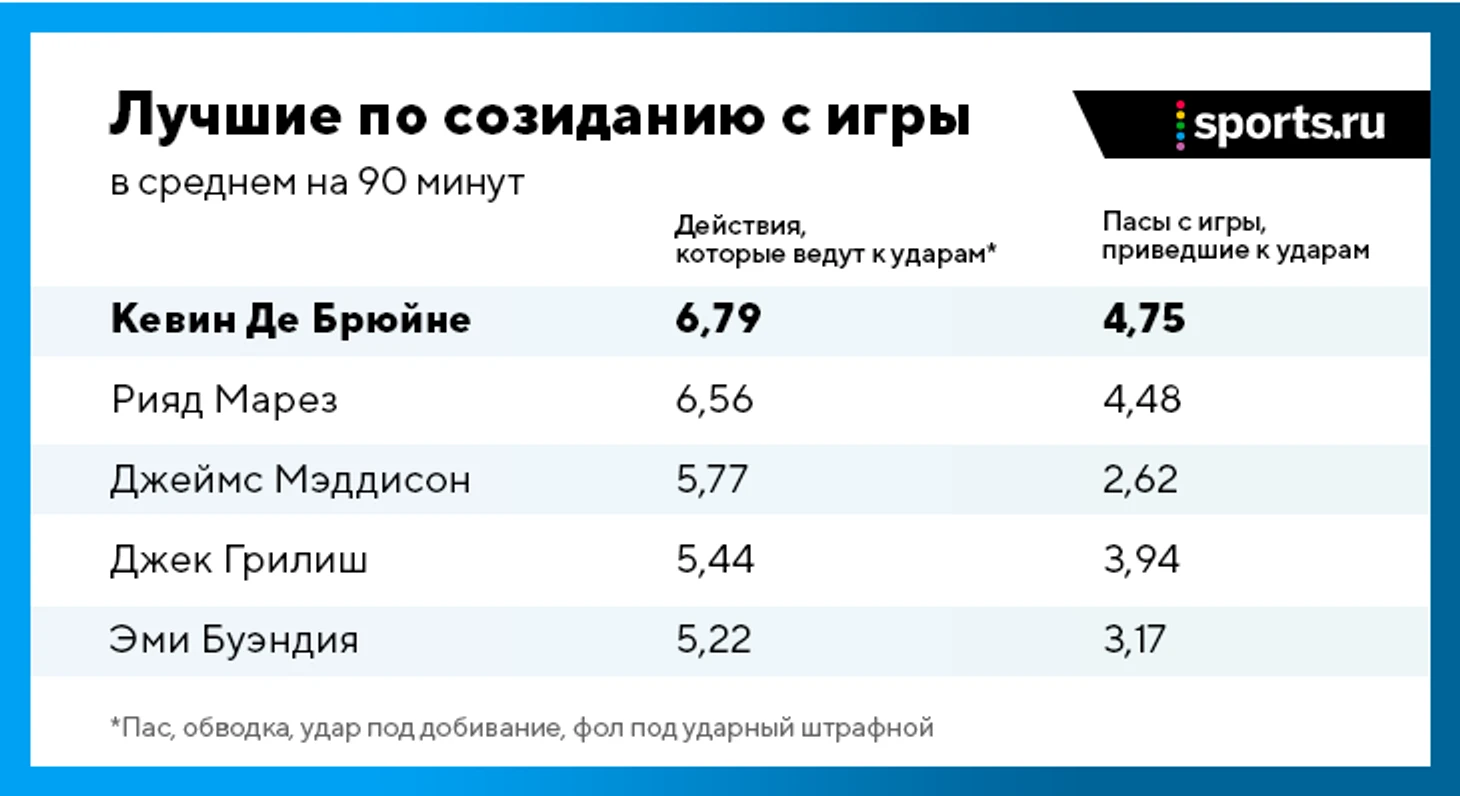 Это цифры StatsBomb. У них особенно жесткие требования к передачам вразрез – проходит между защитниками, отрезает последнюю линию, направлена в пространство и создает острую ситуацию. Такие пасы невероятно цены для обострения, но их немного. В АПЛ Де Брюйне доминирует и по этому показателю.