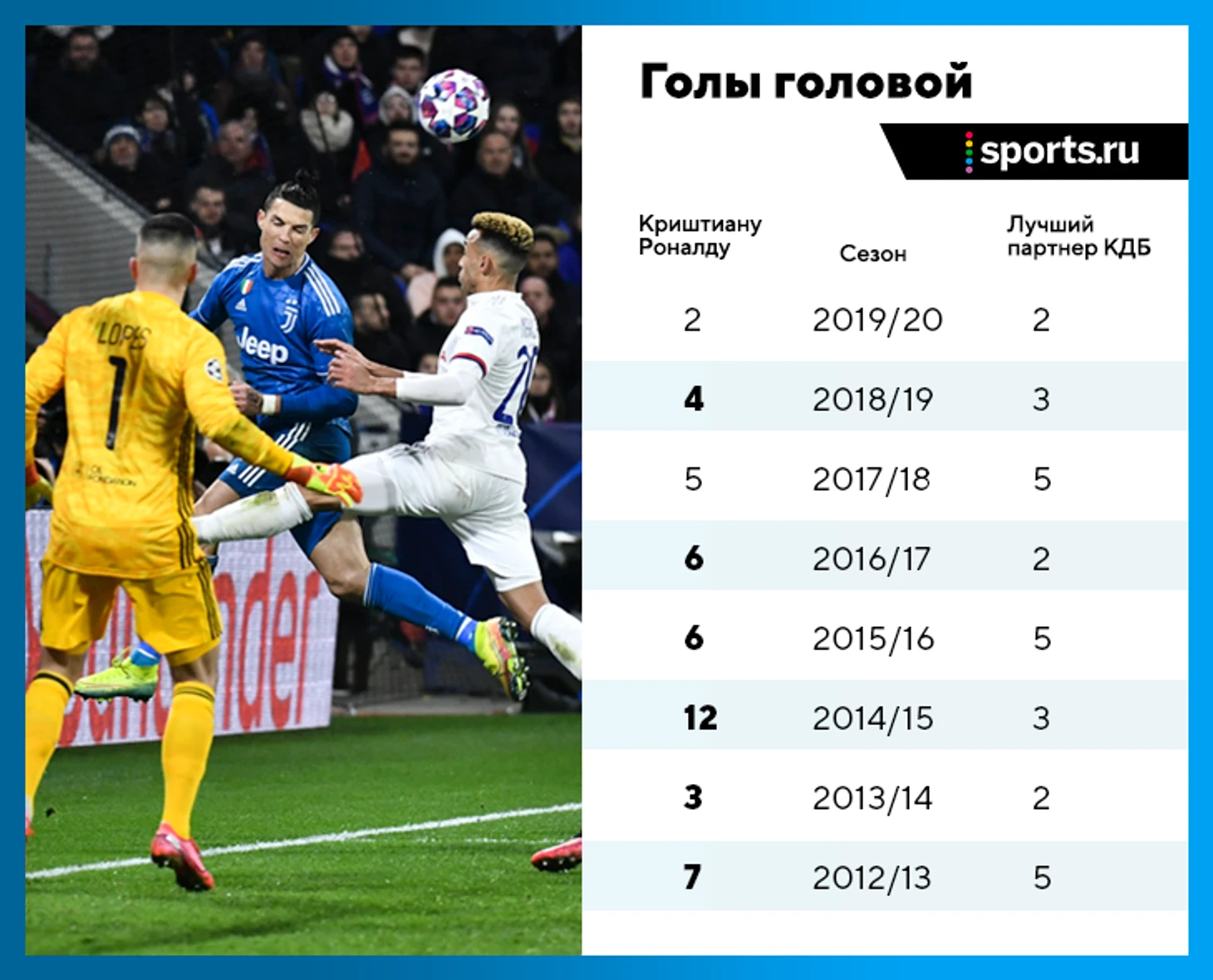 Удивительное противоречие: Кевин – лучший по качеству кроссов со времен Дэвида Бекхэма (сейчас еще ТАА появился в претендентах, но долго КДБ был явно первым) и лучший в истории АПЛ по темпу набора голевых передач. Но бельгиец никогда не играл с партнером, который на топовом уровне завершал бы атаки головой.