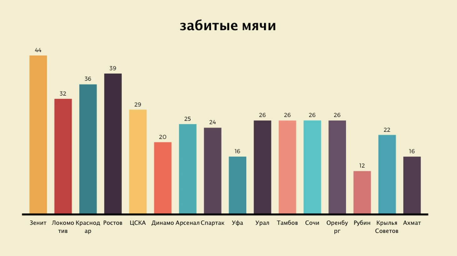 Начнем с простого - количества забитых голов. Лидеры по данному показателю сразу бросаются в глаза. Здесь ничего удивительного. Команды формирующие топ 5 РПЛ на данный момент являются лидерами и по количеству забитых мячей.