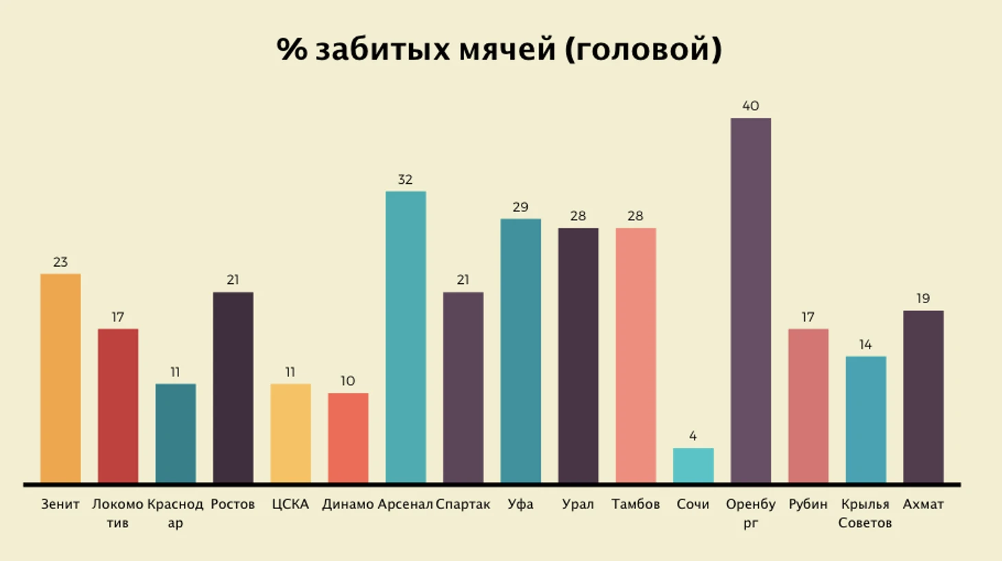 Думаю, тут интереснее всего узнать, какая бы команда не затерялась на "английских полях". С явным отрывом ею является Оренбург - 40% голов которого пришлось на удары головой. Стоит выделить творцов данного успеха - Деспотовича и Фамейе, они забили по 3 таких мяча (каждый). Далее выделяются команды середины таблицы, для которых данный показатель в районе 30% от их общего числа голов. Явные проблемы в игре на втором этаже в атаке у Сочи -- собственными силами был забит только один гол, хотя на наличие большого форварда им грех жаловаться (Заболотный), но как то не сложилось.