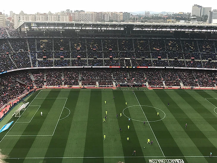На «Камп Ноу» почти всегда остаются свободные места – и ты можешь свободно перемещаться в пределах своего яруса. Минут за пять до старта игры мы переместились в центральный сектор – обзор был намного лучше.