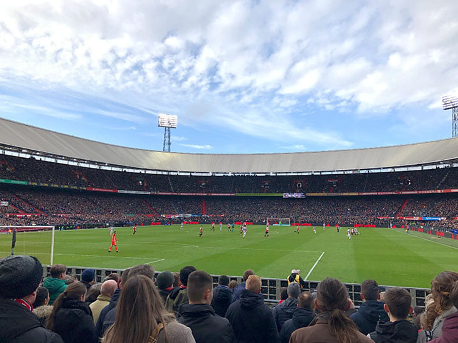 В трех городах нашего путешествия (Волендам, Алкмар и наконец Роттердам) туда катят в основном на велосипедах – все возраста, обязательно с атрибутикой, по широким дорожкам, и едут так плотно, что протиснуться между ними пешеходам почти невозможно. Мы ехали на трамвае, распечатали в кассе зарезервированные билеты и пошли на самый верх трибуны за воротами, поклонившись граффити с Ван Перси и просто кивнув изображению Дирка Кюйта. В проходах толпились плотные мужчины в кепках (видимо, их обычное место), все явно сидели не по билетам, поэтому, чтобы не порушить атмосферу, я положил шарфик на ступеньки и смотрел матч оттуда.
