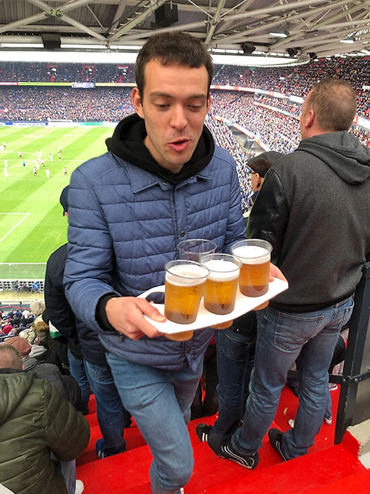 Погоня за пивом оказалась очень долгой: чтобы купить напиток, шоколадку и любую другую еду на стадионе, надо спуститься вниз, обменять в палатке деньги на местную футбольную валюту (что-то вроде жетонов в виде картонной линейки с эмблемами «Фейеноорда») и подняться к пивному ларьку на секторе. За пять жетонов я купил пять стаканов хитрого пива – алкогольного, но всего на три градуса.