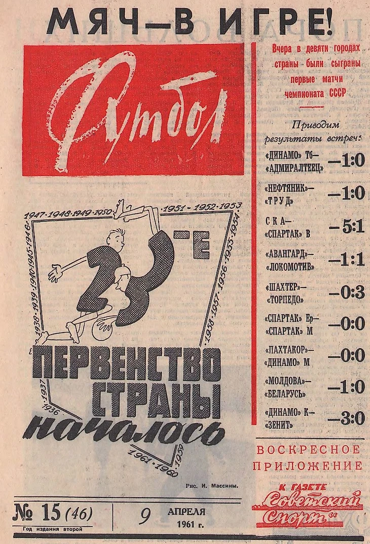 23-й чемпионат СССР стартовал! В высшей лиге три «Спартака» (Москва, Ереван, Вильнюс), три «Динамо» (Москва, Киев, Тбилиси) и две ленинградские команды («Зенит» и «Адмиралтеец»). Да, матч Молдовы и Беларуси – это не игра сборных советских социалистических республик: в 1961 году так назывались кишиневский «Зимбру» и минское «Динамо».