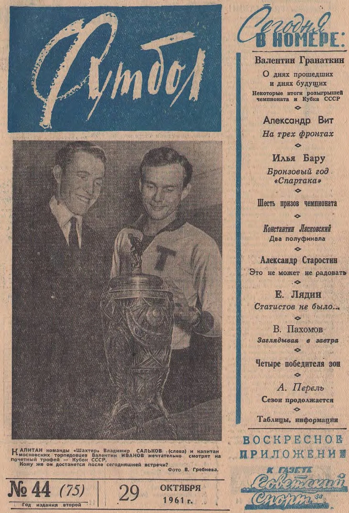 В финал Кубка СССР вышли московское «Торпедо» и сталинский (совсем скоро – донецкий) «Шахтер». Со счетом 3:1 победу одержали футболисты с Донбасса. Но на следующую обложку «Футбола» триумфаторы не попали.