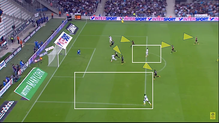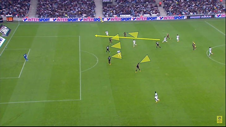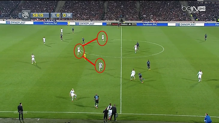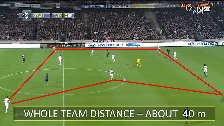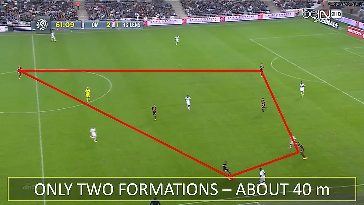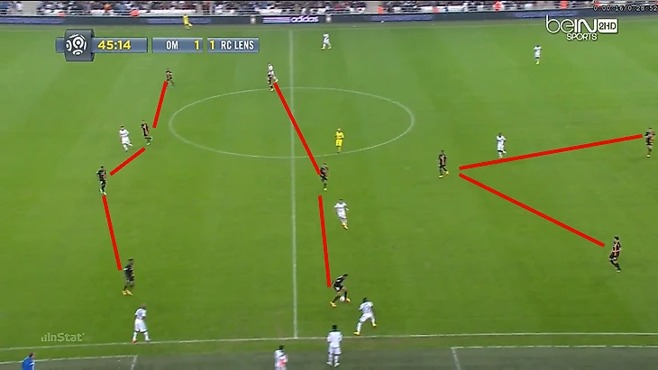 Обратите внимание на сходство "Ланса" и "Лиона". Как и в предыдущей игре, соперники ОМ начинают с прессинга тремя высоко расположенными игроками, которых поддерживает вторая линия из трех полузащитников. А четыре защитника двигались как единое целое с движением мяча:
