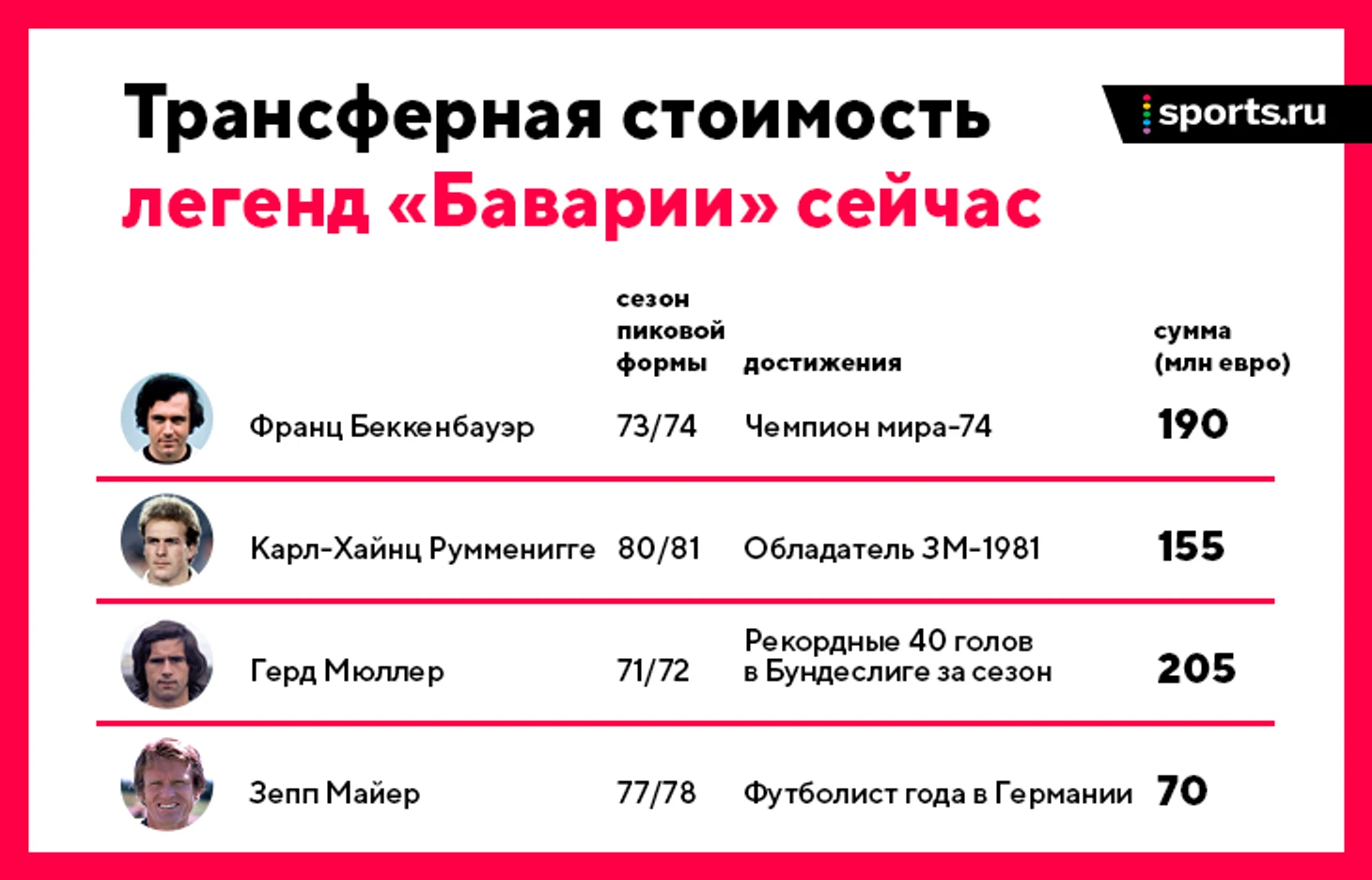 Система ТМ настолько универсальна, что с ее помощью можно оценить даже звезд из прошлого. В этом сезоне пользователи выяснили, сколько стоили бы легенды «Баварии» в пиковой форме. «Для них мы брали те же параметры, с помощью которых сейчас определяем ценность игрока: возраст, позиция, результаты и достижения. И все это переложили на реалии современного рынка», – объясняет Зайдель.